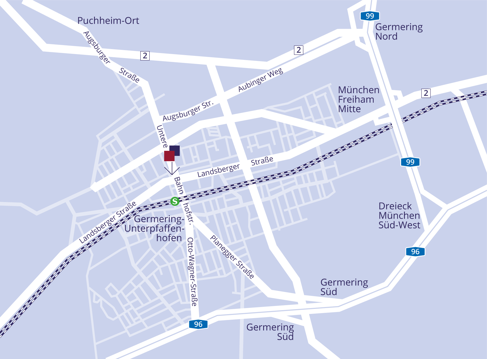 Sie finden unsere Praxis in der Unteren Bahnhofstrasse 38 in Germering. Die Praxisräume befinden sich im 1. Stock über der St. Martin Apotheke, ca. 100 Meter nördlich der Stadthalle Germering und etwa 3 Gehminuten vom S-Bahnhof Germering-Unterpfaffenhofen entfernt.